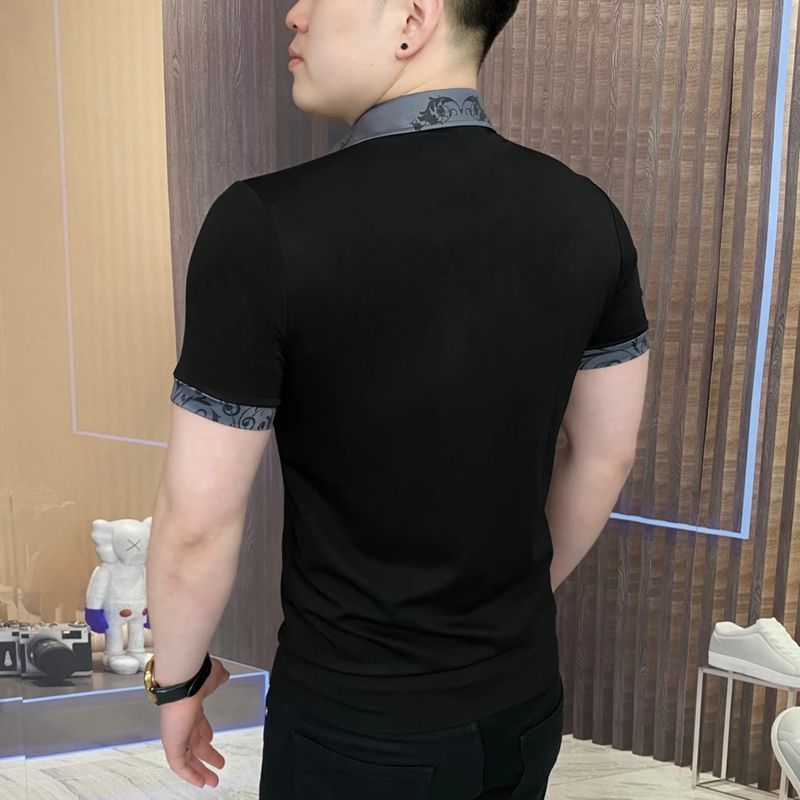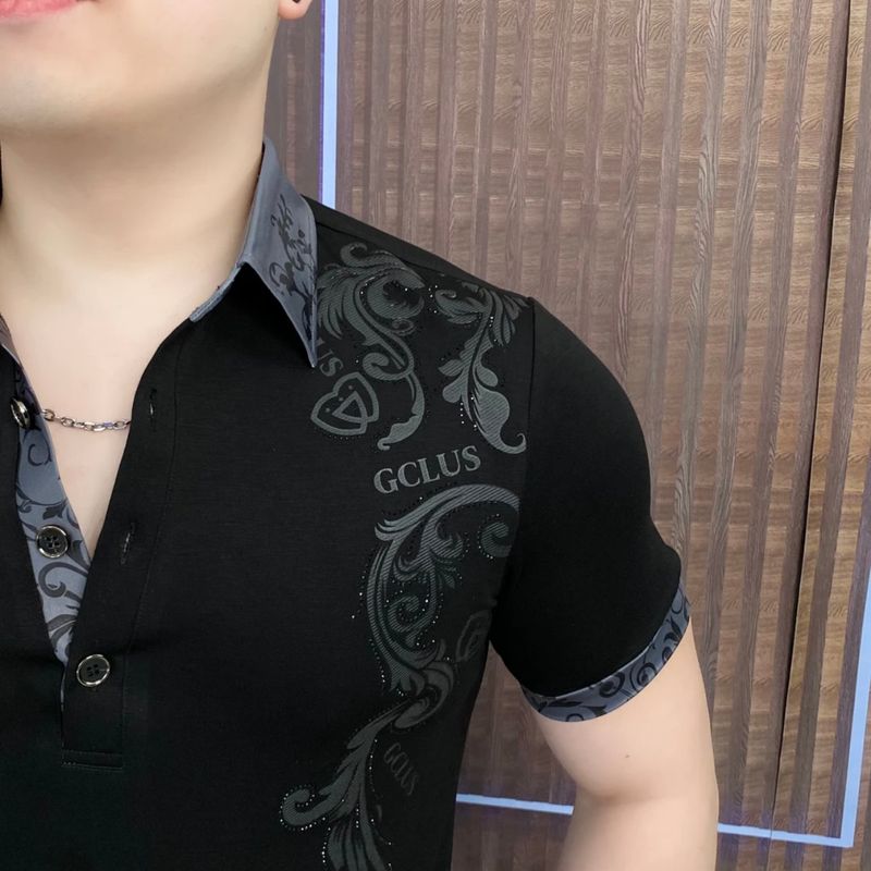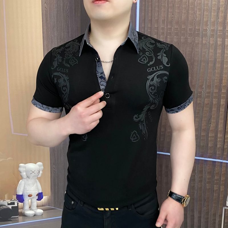 The new summer men's lapel positioning printed diamond embossed short-sleeved T-shirt is fashionable, form-fitting and elastic POLO short-sleeved