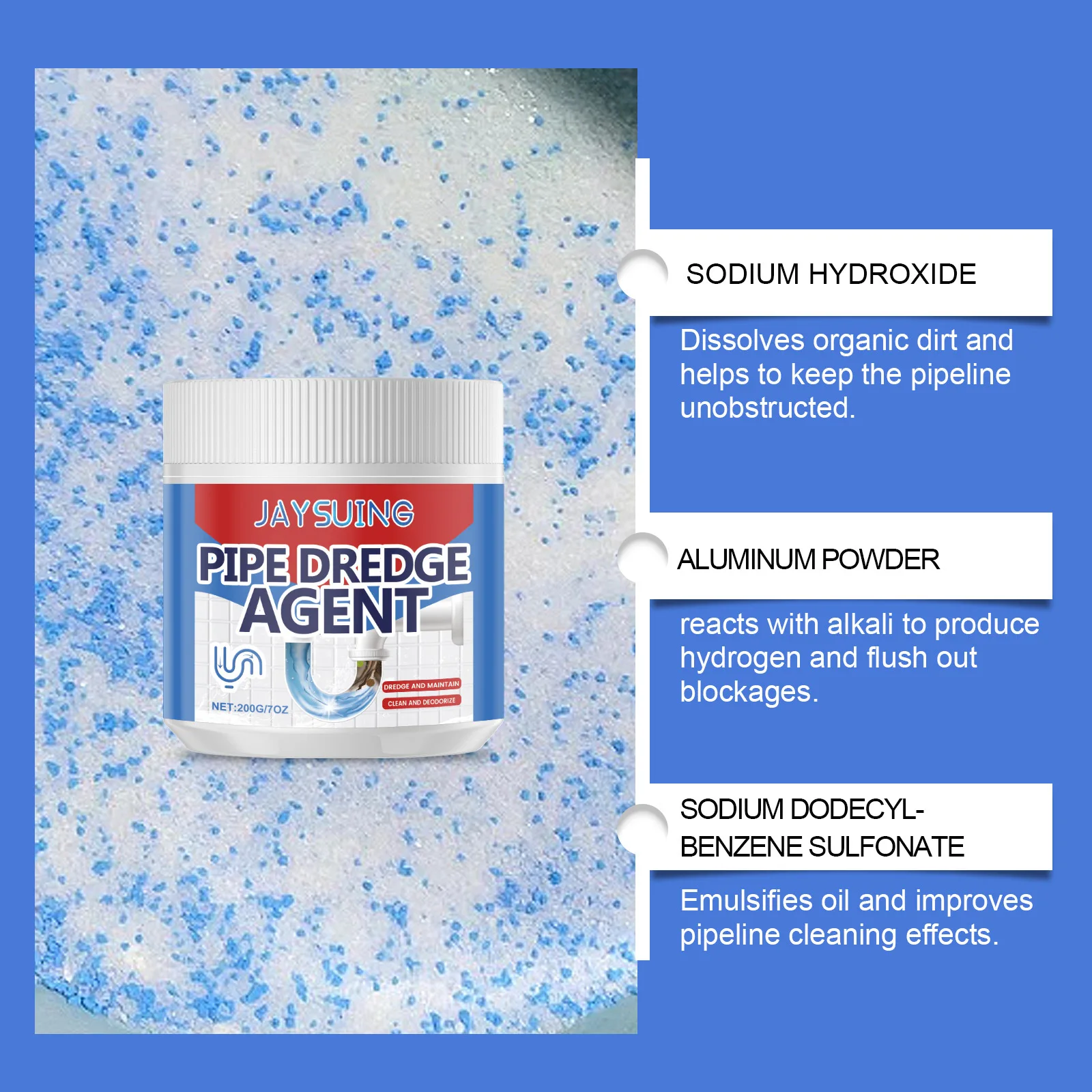 Jaysuing Pipe Dredge Agent is a highly effective solution for maintaining and cleaning your kitchen and bathroom drains. This powerful formula is de